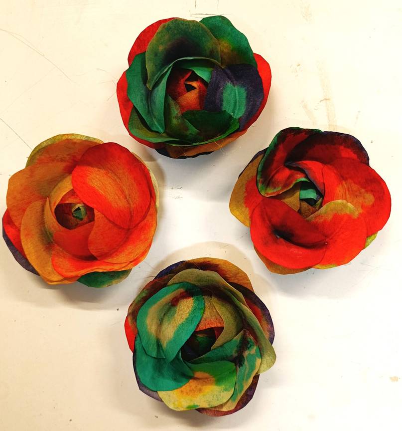 “In deze workshop nemen we een abstracte vorm van een roos als basis,” legt de kunstenares uit. “Binnen dat kader kunnen deelnemers experimenteren met bepaalde details, zoals de rozenblaadjes, maar in de eerste plaats met de kleuren. We streven er niet naar om klassieke rode rozen te maken, maar om met veel fantasie kleuren te combineren. De koffiefilters kunnen heel goed de inkt absorberen, met prachtige kleurnuances als gevolg.”