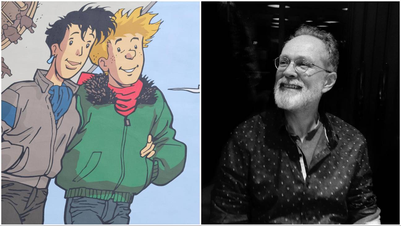 | Frank Pé (r.) is op 69-jarige leeftijd overleden. Hij was vooral bekend van de Brusselse avonturen van stripfiguur Ragebol (l.), hier met zijn vriendin afgebeeld op een muur in de Kolenmarkt.