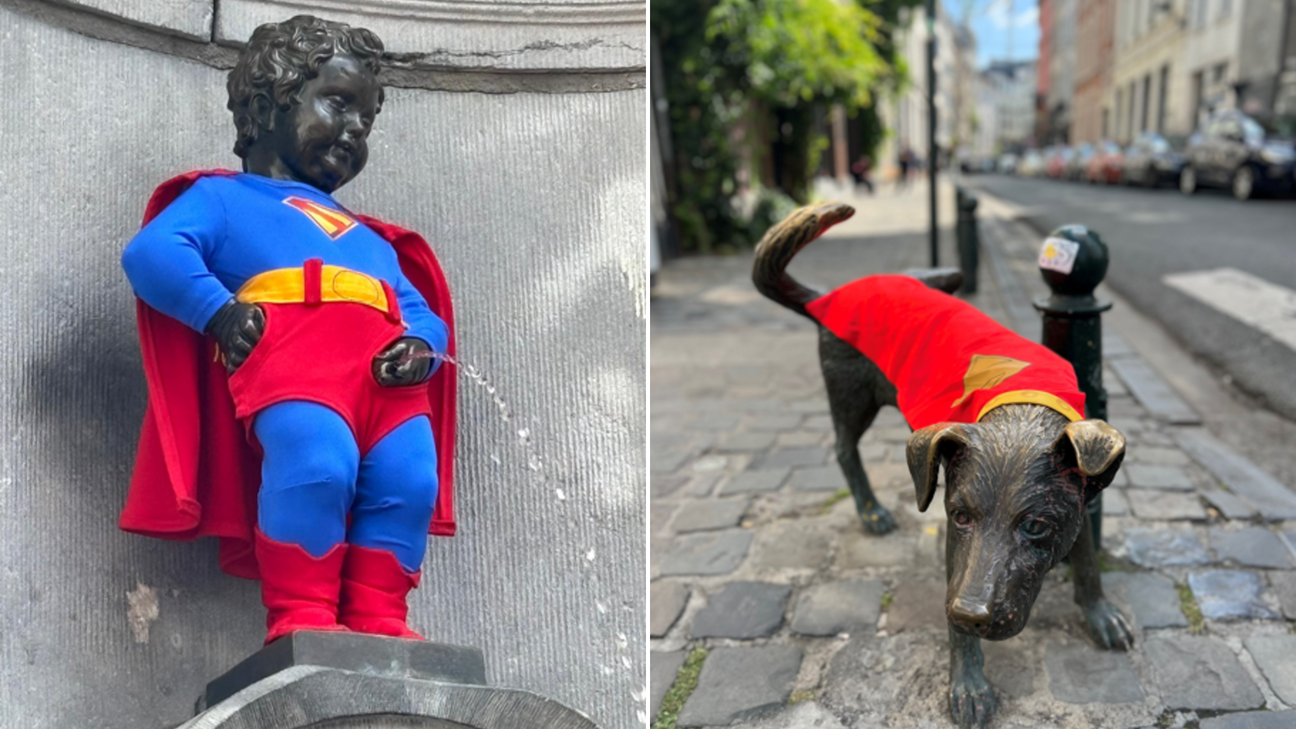Niet alleen Manneken Pis kreeg een superheldenoutfit. Ook Zinneke Pis, het standbeeld van een plassende hond in de Kartuizersstraat, draagt een Superman-cape. Die verwijst naar Krypto, de trouwe viervoeter van Superman, die een prominente rol speelt in de nieuwe film.