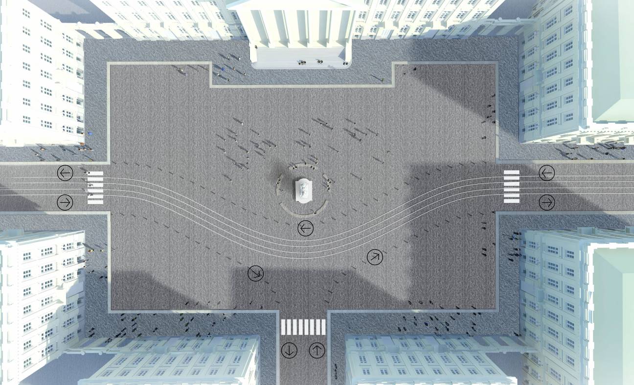 De voormalige rotonde werd opnieuw ingericht voor voetgangers, met een duidelijk afgebakende zone voor het verkeer. Volgens Visit Brussels en bouwheer Beliris ontstaat er zo een open en aangename plek in de stad, die het Brussels erfgoed volop tot zijn recht laat komen.