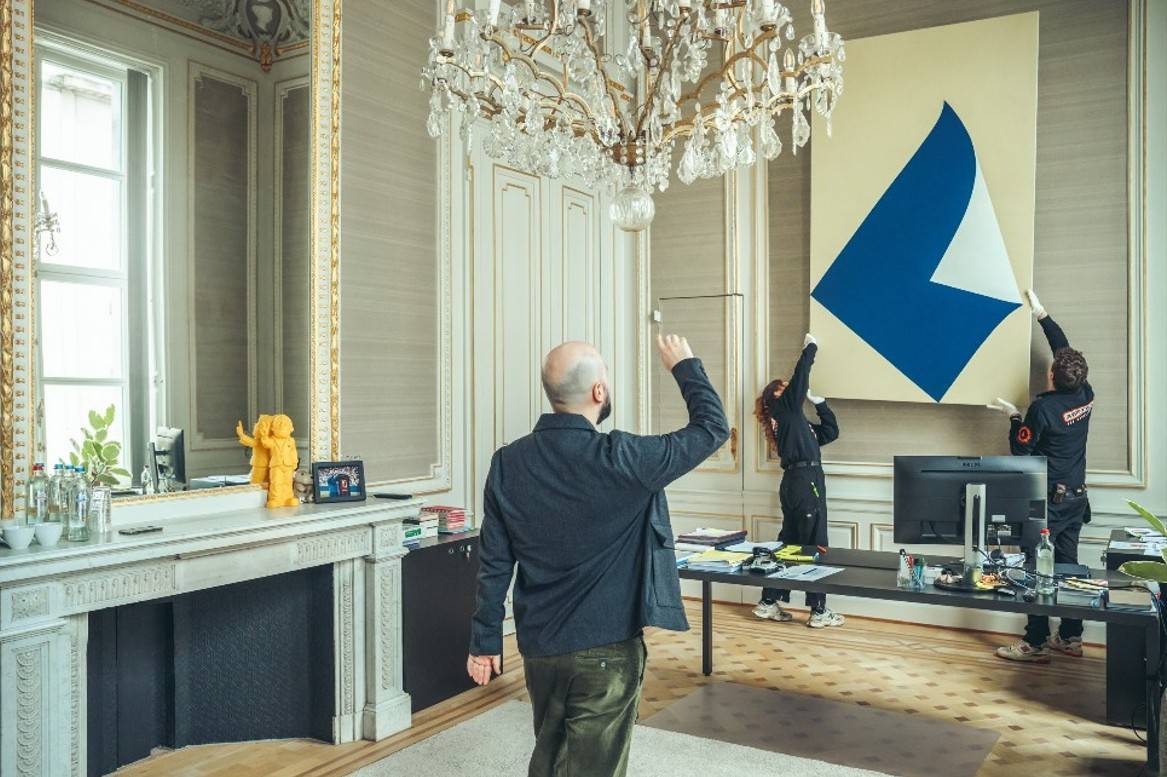 "Ja, kort na de start van de federale regering - zowat een jaar geleden - werd ik uitgenodigd om te kijken hoe we het zouden aanpakken. De monumentale muur achter het bureau bleek de evidente locatie. Het kabinet wordt gekenmerkt door vergulde lijsten en negentiende-eeuwse accenten. Daarom koos ik voor blauw als complementaire kleur. Dat brengt rust en evenwicht. Het formaat is tot op de centimeter berekend zodat het werk perfect in de ruimte past.”