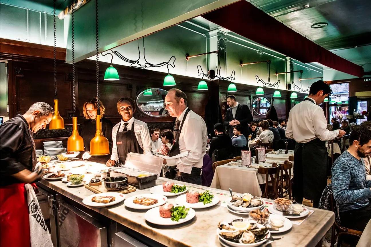 Het interieur lijkt op dat van een oude brasserie, met houten elementen, groene art-nouveaulampen en papieren tafelkleden. De sfeer is warm en traditioneel. De obers dragen zwart-witte kledij en zijn vriendelijk.