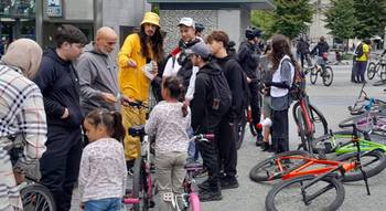Tricks doen met de fiets, zoals rijden op ons achterwiel. We zijn in een groep, en we zijn in de stad.