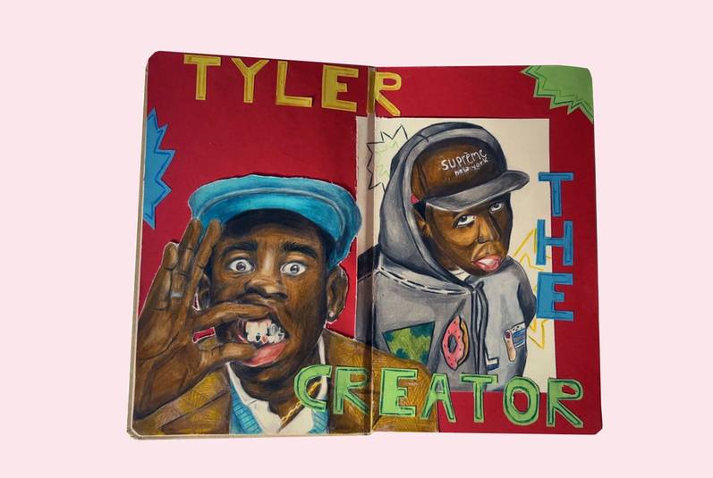 Muziek Ik luister graag naar muziek en dan teken ik graag de artiest. Tyler, the Creator is de laatste die ik maakte (zie foto hierboven). Ik hou van wie hij is als persoon, hij is heel open-minded. Zijn kleding inspireert en ook zijn teksten. Sommige liedjes klinken zomers met good vibes en andere zijn meer krachtig.