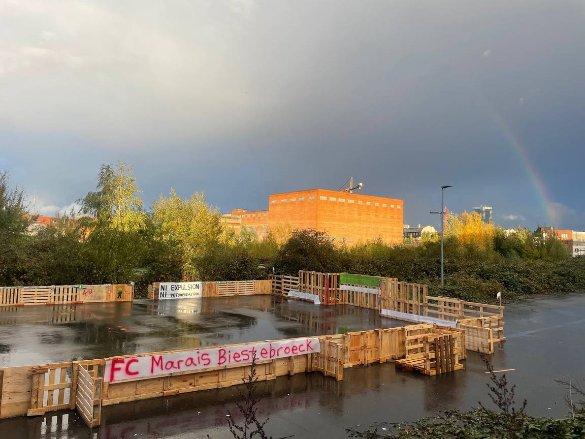 Op de voormalige Shell-site in Anderlecht staat een nieuwe houten constructie die moet dienen als voetbalveld. De actiegroep Alliance Marais Biestebroeck wil er volgende maand een toernooi houden met jongeren uit de buurt, om aan te tonen hoe veel de groensite kan betekenen voor de wijk.