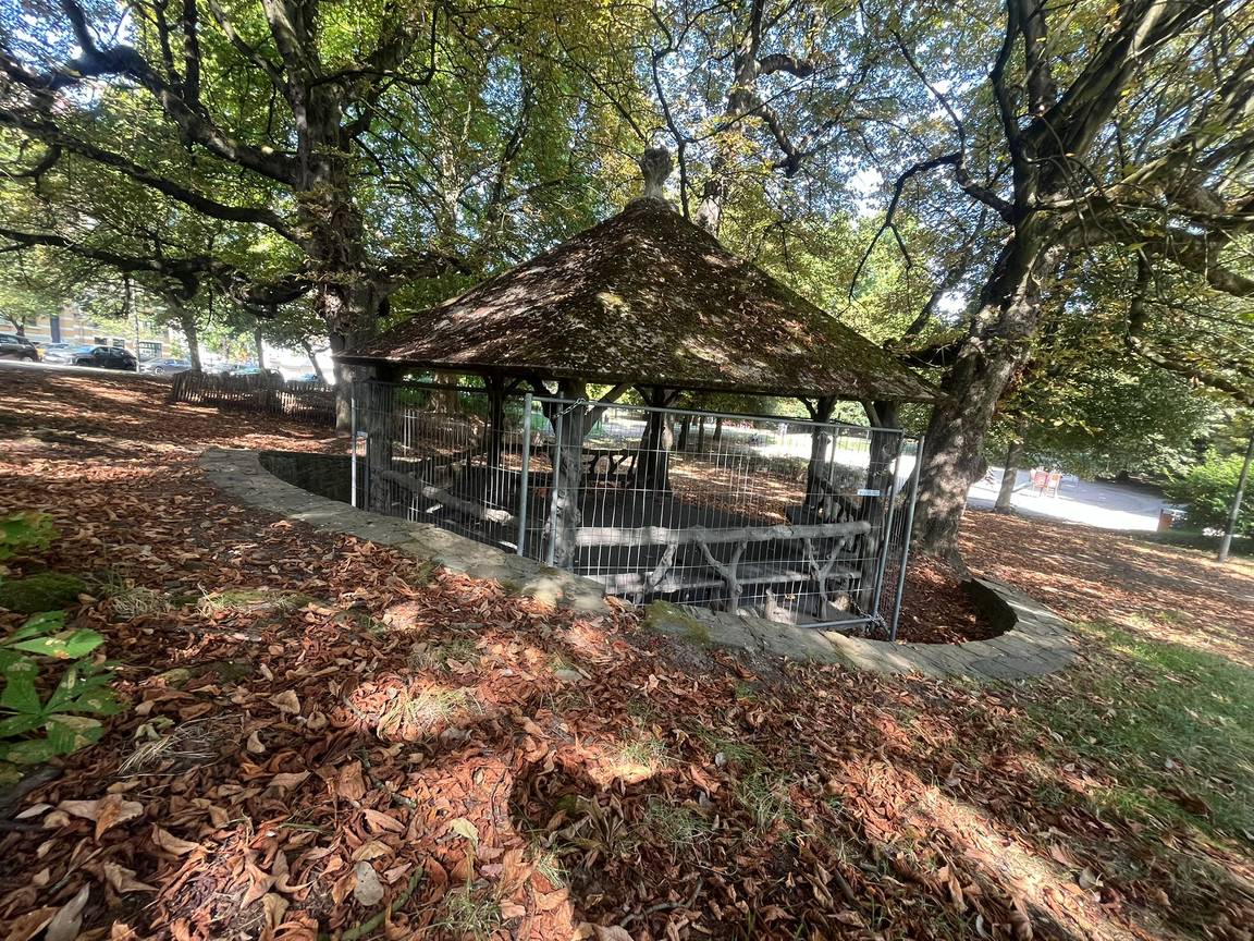 Even schuilen voor de regen of de zon in de bekende kiosk in het park voor het station van Schaarbeek is momenteel niet mogelijk. Rond het gebouwtje liet de gemeente onlangs ijzeren hekken plaatsen.