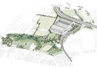 | Een render uit het gelekte MER van het nieuwe stadion dat Union Sint-Gillis wil bouwen op de Bemptsite in Vorst.