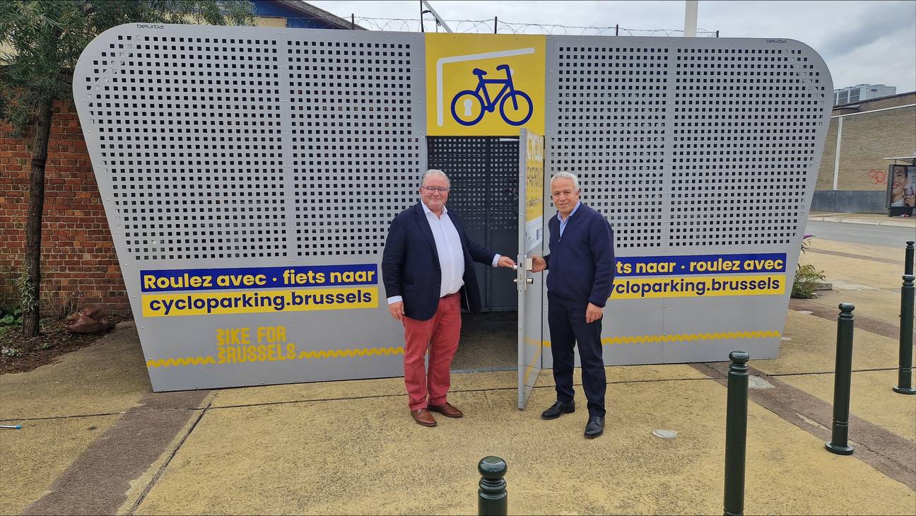 | Burgemeester Christian Lamouline (Les Engagés) en Mobiliteitsschepen Ali Bel-Houssine (PS) voor de nieuwe Cycloparking.