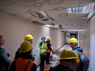 Tijdens de rondleiding, die werd verdergezet in het te ontmantelen bouwwerk, blijkt alvast de erbarmelijke staat van het gebouw binnenin. Het gebouw kampt met asbest en bouwingrepen die tegen regelgeving in gaan.