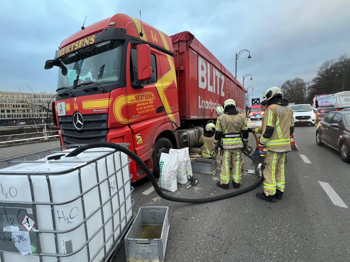 | Een vrachtwagen heeft diesel gelekt op de Werkhuizenkaai, wat leidde tot een lang oliespoor en heel wat verkeershinder.