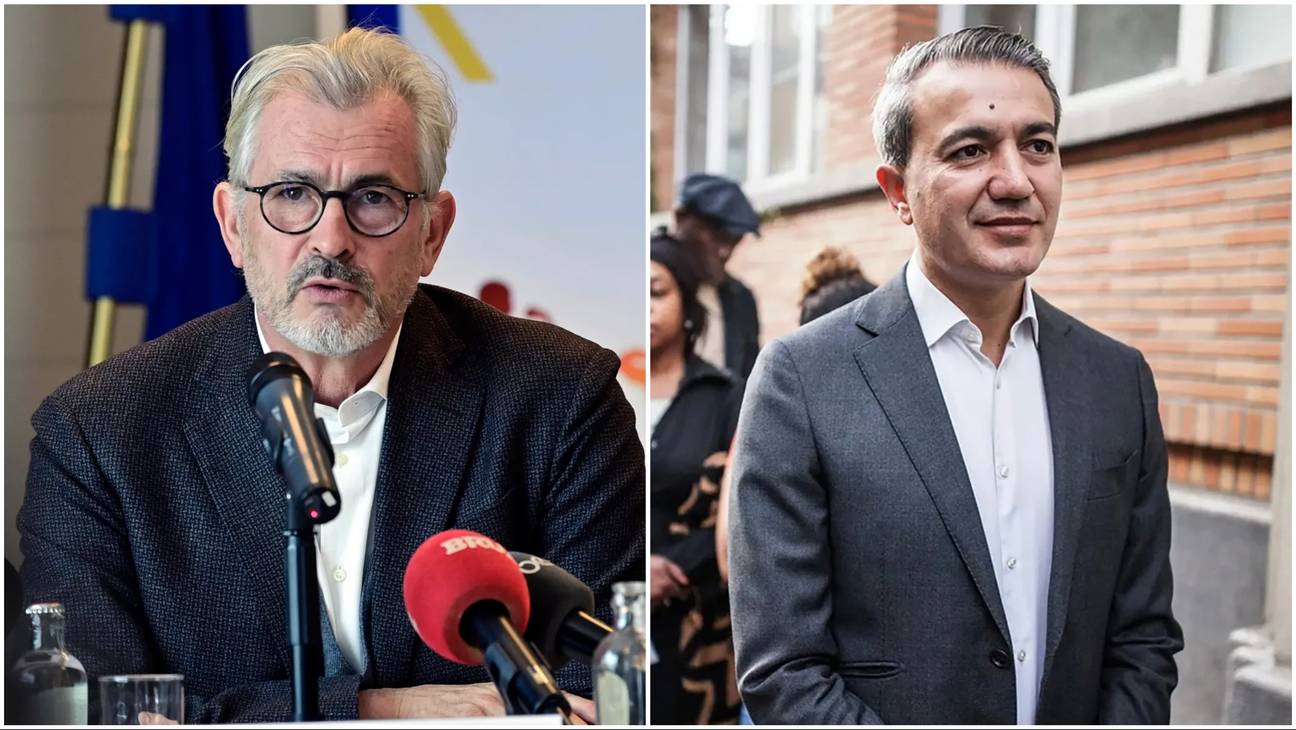 | Ontslagnemend Brussels minister voor Plaatselijke Besturen Bernard Clerfayt (Défi, l.), Burgemeester van Sint-Joost-ten-Node Emir Kir (Onafhankelijk, r.)