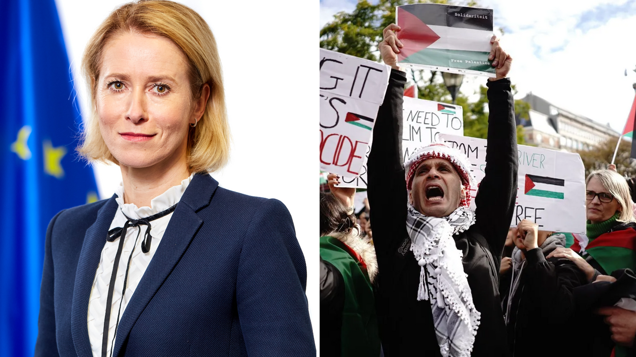 | De actiegroep hoopt ook een lijst van namen af te geven aan Kaja Kallas, de Hoge Vertegenwoordiger van de Europese Unie voor Buitenlandse Zaken (links). In Brussel komen mensen regelmatig op straat om actie te voeren tegen de oorlog (archiefbeeld rechts).