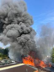 | Een hevige dakbrand zorgt voor veel rookontwikkeling.