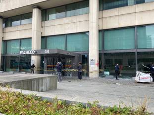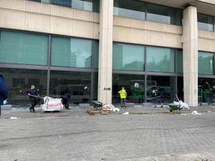 De schade aan het gebouw van de Dienst Vreemdelingenzaken aan de Pachecolaan is aanzienlijk. Alle ruiten zijn vernield en ook de hoofdingang is onbruikbaar. Ze zijn afgesloten met OSB-platen. Voor het personeel en de bezoekers zijn er alternatieve ingangen voorzien.