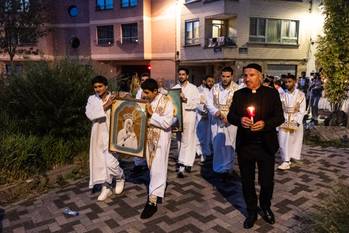 Duizendtal gelovigen op straat voor kaarsjesprocessie in Jette