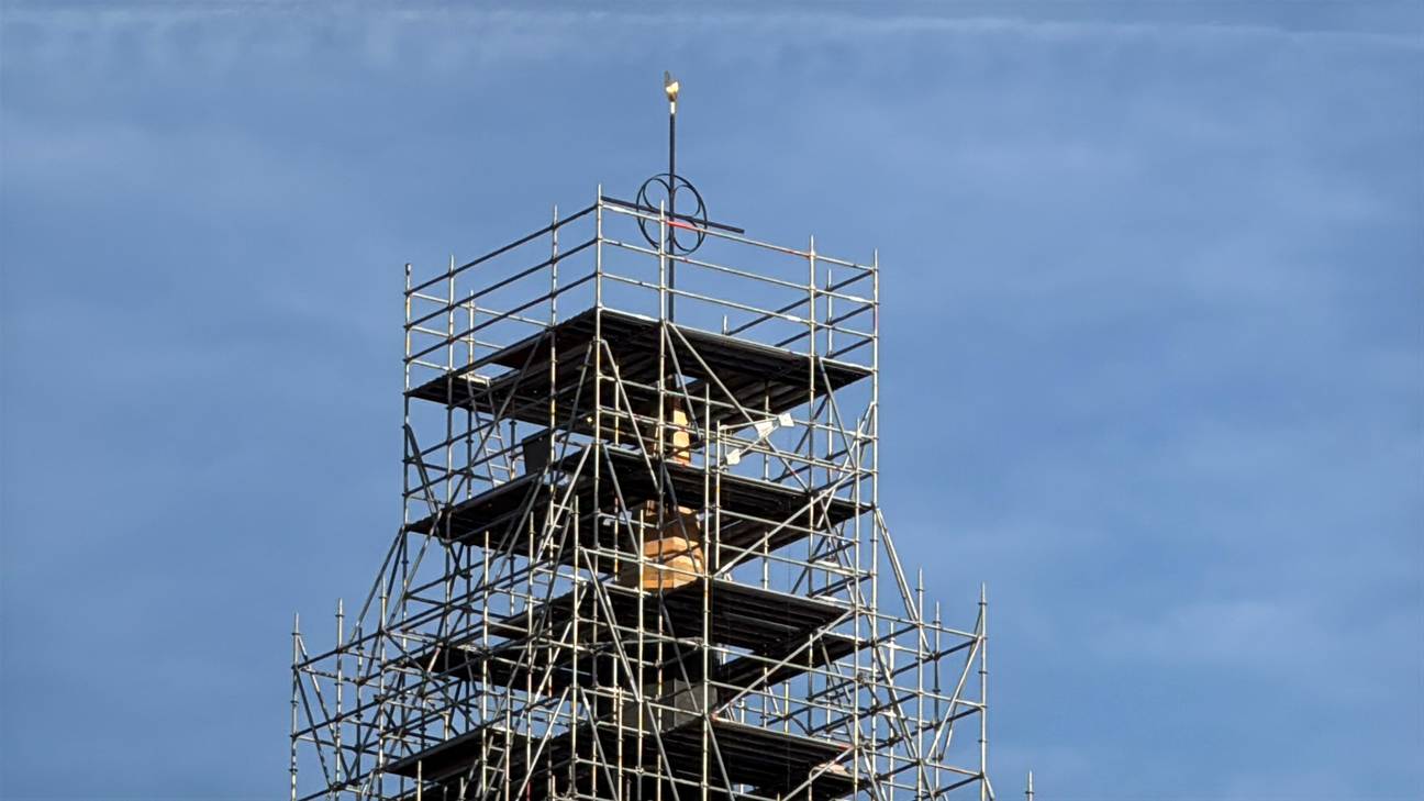 Het nieuwe kruis betekent nog niet meteen het sluitstuk van de verbouwingswerken. Er moet nog verder gewerkt worden aan de toren, wat betekent dat de stelling aan de voorgevel nog niet meteen verdwijnt.