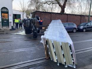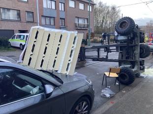 Het ongeval gebeurde op de openbare weg, aan de tramhalte Van Haelen. Op beelden valt te zien dat de heftruck dwars over de weg ligt, net als de vermoedelijke lading. Die viel op de motorkap van een geparkeerde auto.