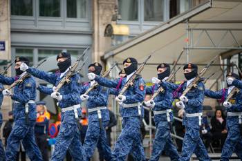 Vervolgens hebben verschillende componenten van Defensie gedefileerd. Dit onder het goedkeurende oog van premier Bart De Wever (N-VA), de minister van Defensie Theo Francken (N-VA) en minister van Binnenlandse Zaken Bernard Quintin (MR). Verder tekenden ook nog vertegenwoordigers van het Grondwettelijk Hof, het Hof van Cassatie, de Agglomeratie van het Brussels Hoofdstedelijk Gewest en de stad Brussel present. Premier De Wever had - opvallend genoeg - als een van de weinigen een klaproos opgespeld, een verwijzing naar de klaprozen nabij het front in West-Vlaanderen - waar vele Vlamingen en Belgen het leven hebben gelaten. De klaproos is het symbool bij uitstek voor de Eerste Wereldoorlog.