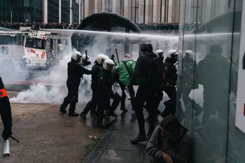 De politie heeft even verderop opnieuw het waterkanon ingezet en verschillende malen traangasgranaten ingezet om de betogers te verdrijven. Daarbij zijn betogers en politie met elkaar op de vuist gegaan. De politie chargeerde verder nog met traangas en de matrak in de aanslag om hen te verdrijven van het Europakruispunt, waar omstreeks 14.25 uur de rust terugkeerde.