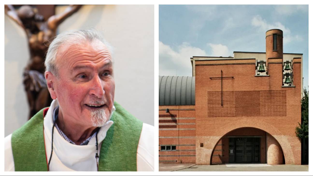 | Priester Hugo Vangeel (l.) werd 83, hij was van 1997 tot 2017 priester van de Sint-Rochuskerk (r.) in de Brusselse Noordwijk.