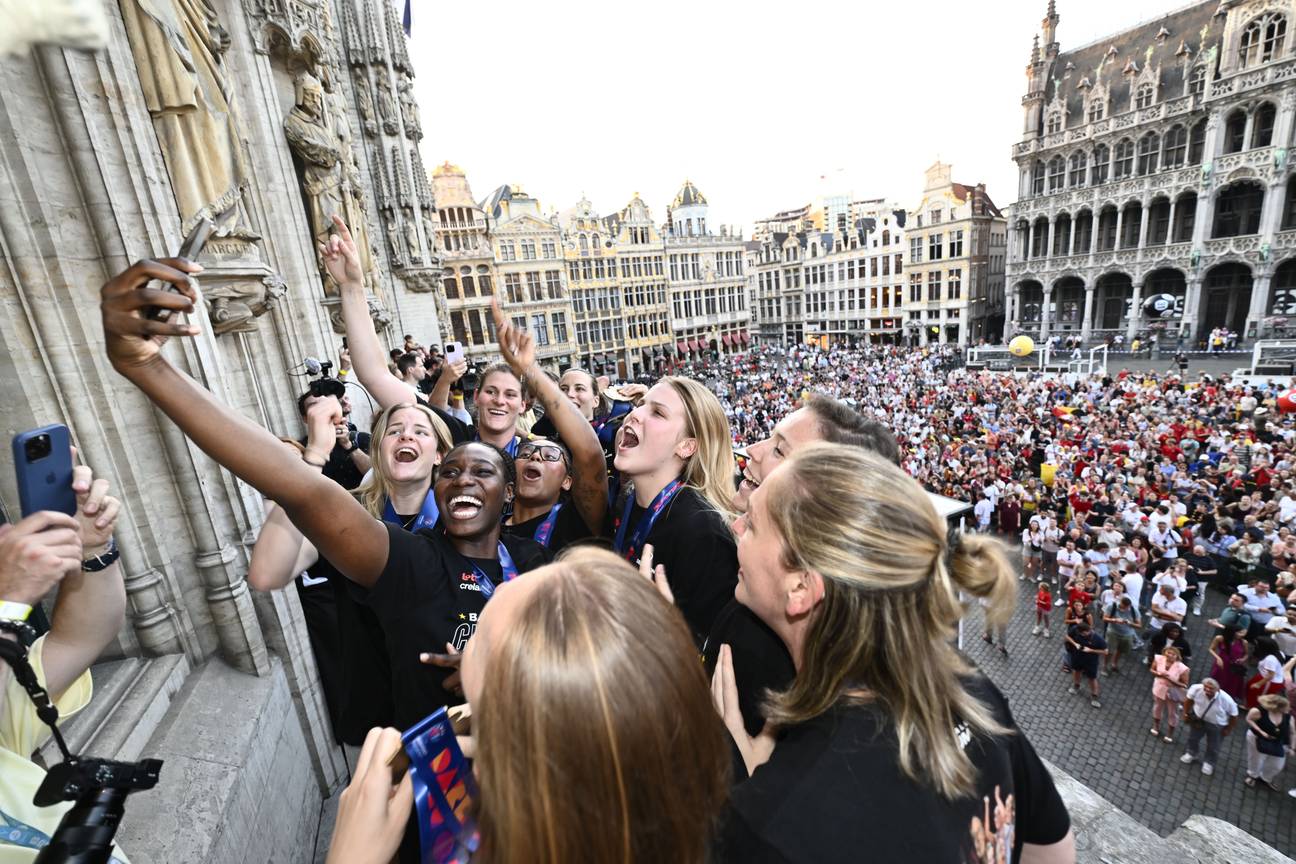 De Grote Markt van Brussel kleurde maandagavond zwart, geel en rood om de Belgian Cats te vieren, daags nadat de Belgische basketvrouwen hun tweede opeenvolgende Europese titel hadden veroverd. Met enkele uren vertraging vanwege een volle agenda, verscheen het gezelschap aangevoerd door MVP Emma Meesseman op het balkon van het Stadhuis, waarna de mensenmenigte hen luid toejuichte.