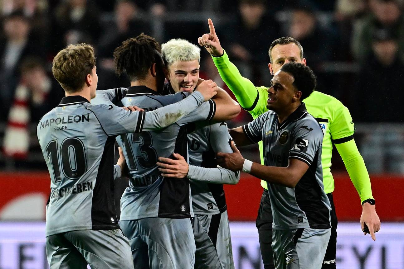 | Tristan Degreef wordt gefeliciteerd door zijn medespelers nadat hij het tweede doelpunt heeft gescoord.