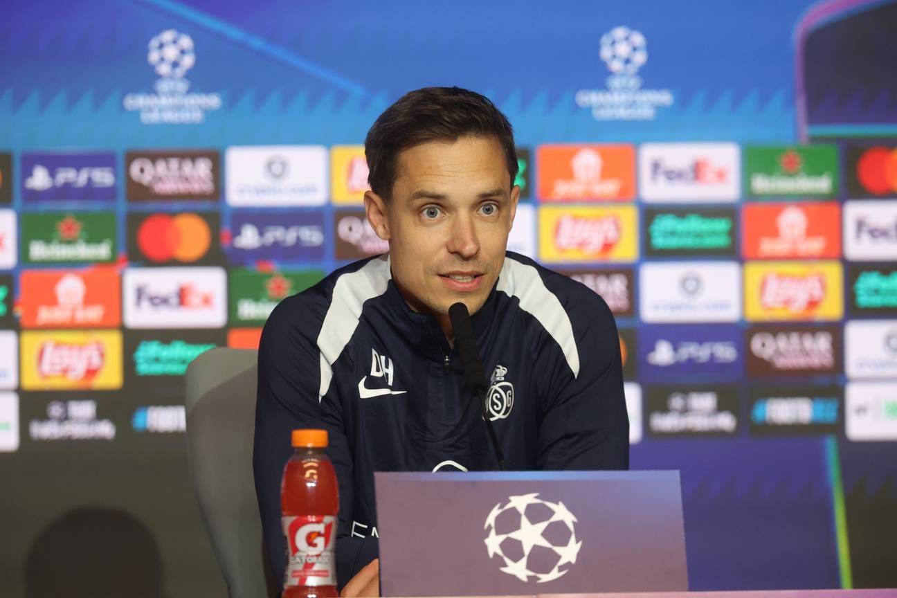 | Union-trainer David Hubert op het traditionele persmoment voor de wedstrijd tegen Atlético Madrid.