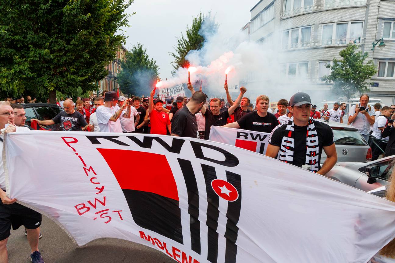 | RWDM-fans tijdens een mars tegen de naamsverandering in Daring Brussels.