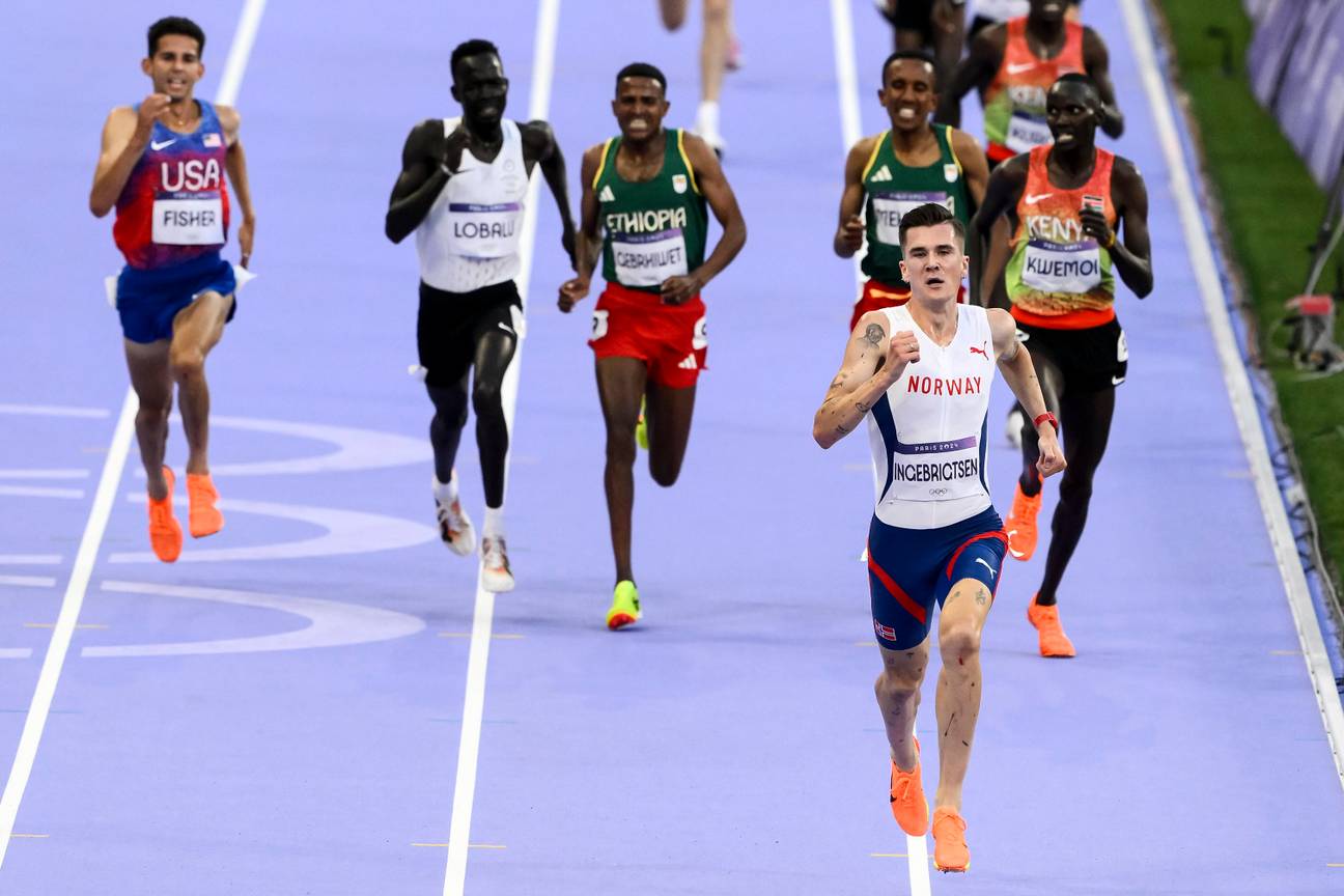 | Jakob Ingebrigtsen op de 5.000 meter tijdens de Spelen van Parijs in 2024.