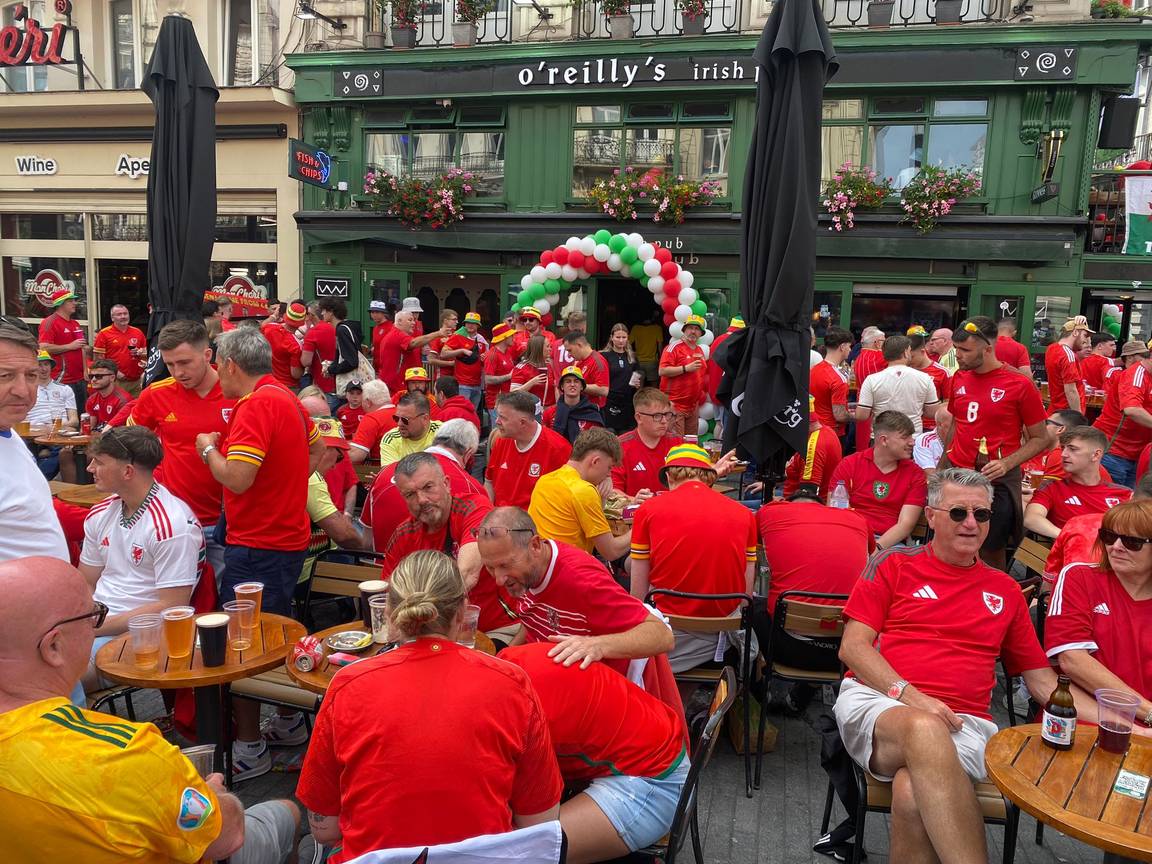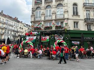 | Welshe supporters verzamelen aan O'Reilly's aan het Beursplein. Vanavond nemen de Rode Duivels het in de kwalificaties voor het WK voetbal op tegen Wales.