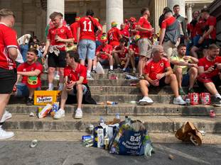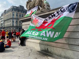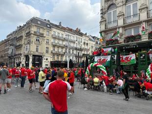 Niet dankzij supporters van de Rode Duivels, maar wel door de Welshe aanhang kleurt het Brussels stadscentrum vandaag opvallend rood.