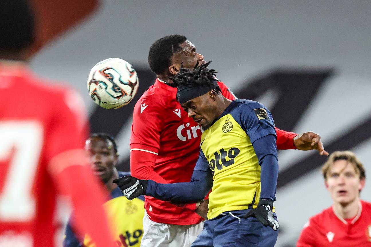 | Josue Homawoo (Standard) en Mohammed Fuseini (Union) duelleren om de bal tijdens de Valentijnstopper in de Jupiler Pro League.