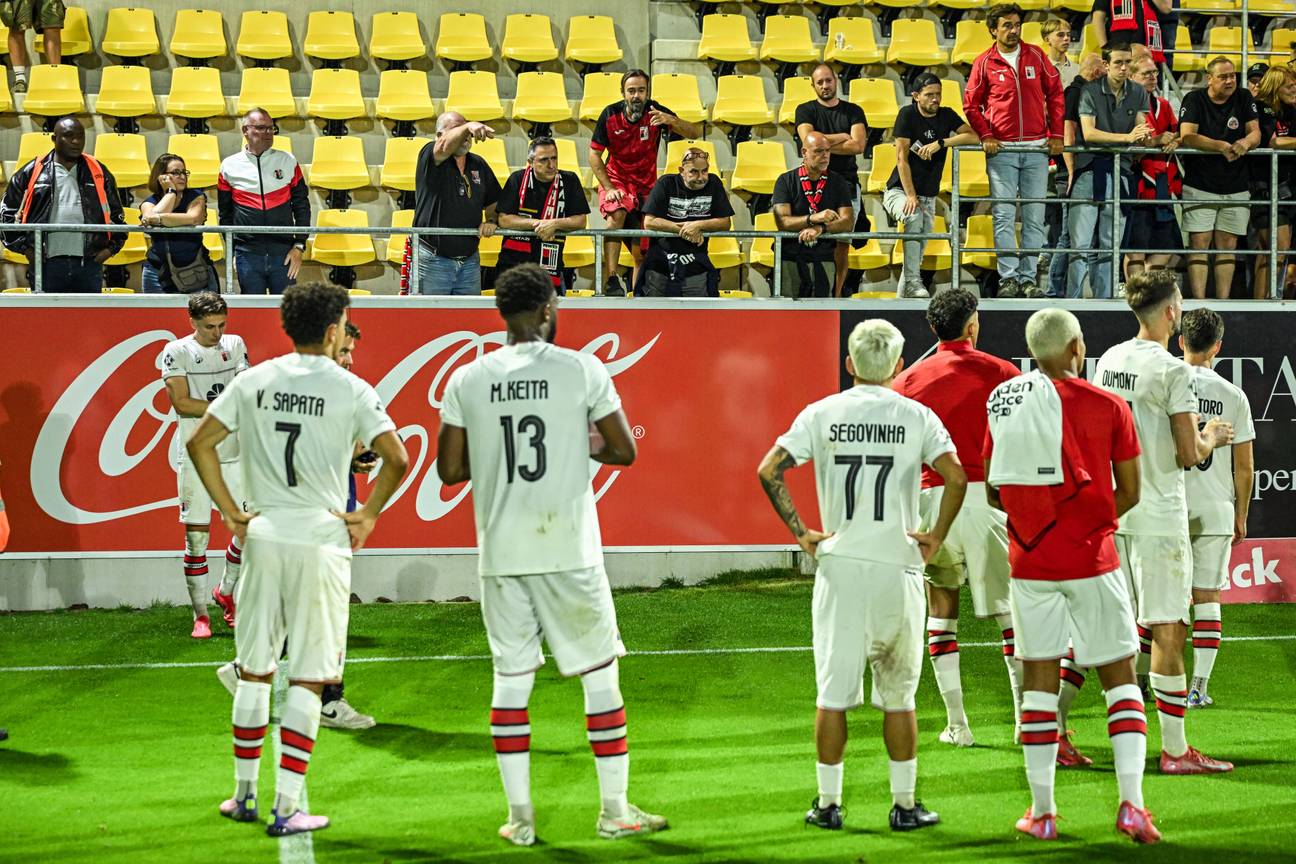 | De RWDM-spelers mochten het na afloop van de wedstrijd gaan uitleggen bij de meegereisde supporters.