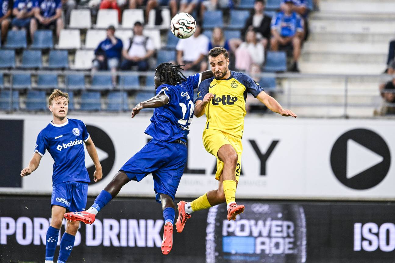 | Charles Vanhoutte, die in de belangstelling staat van OGC Nice, wint een kopbalduel in de uitwedstrijd tegen AA Gent, eerder dit seizoen.