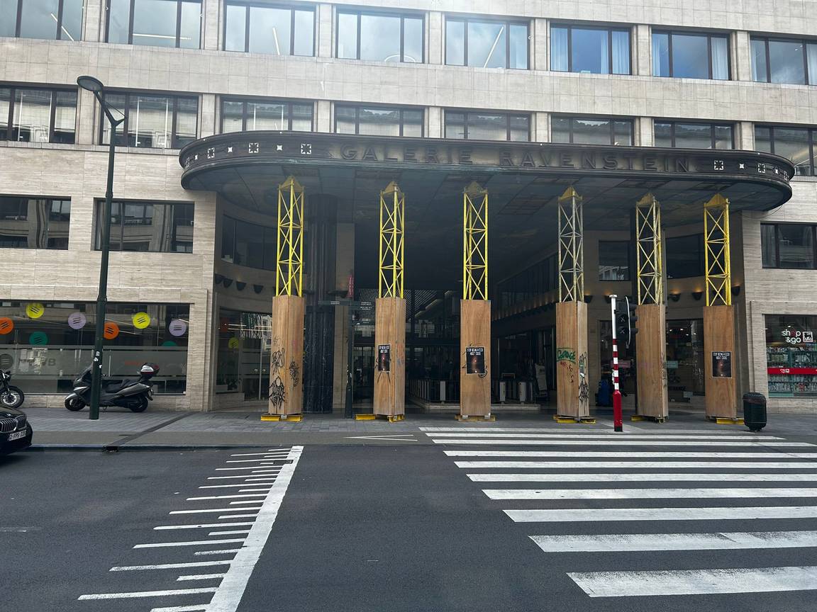 De Ravensteingalerij in Brussel-Stad ligt tussen de Ravensteinstraat en de Kantersteen, vlak bij het treinstation Brussel-Centraal. De luifel boven de ingang langs de Kantersteen is al een tijd gestut door stellingen, na een stabiliteitsstudie in 2023. "Er was een matig risico op instorting, dus alle voorzorgsmaatregelen zijn daar getroffen," zegt woordvoerder Nils Quintelier van staatssecretaris voor Stedenbouw Ans Persoons (Vooruit).