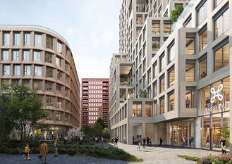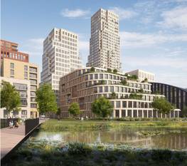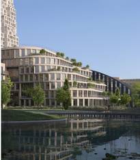 | Render van het project Lake Side dat Nextensa wil realiseren op de site van Thurn en Taxis. In de eerste fase moeten de drie meest rechtse gebouwen in beeld verrijzen.