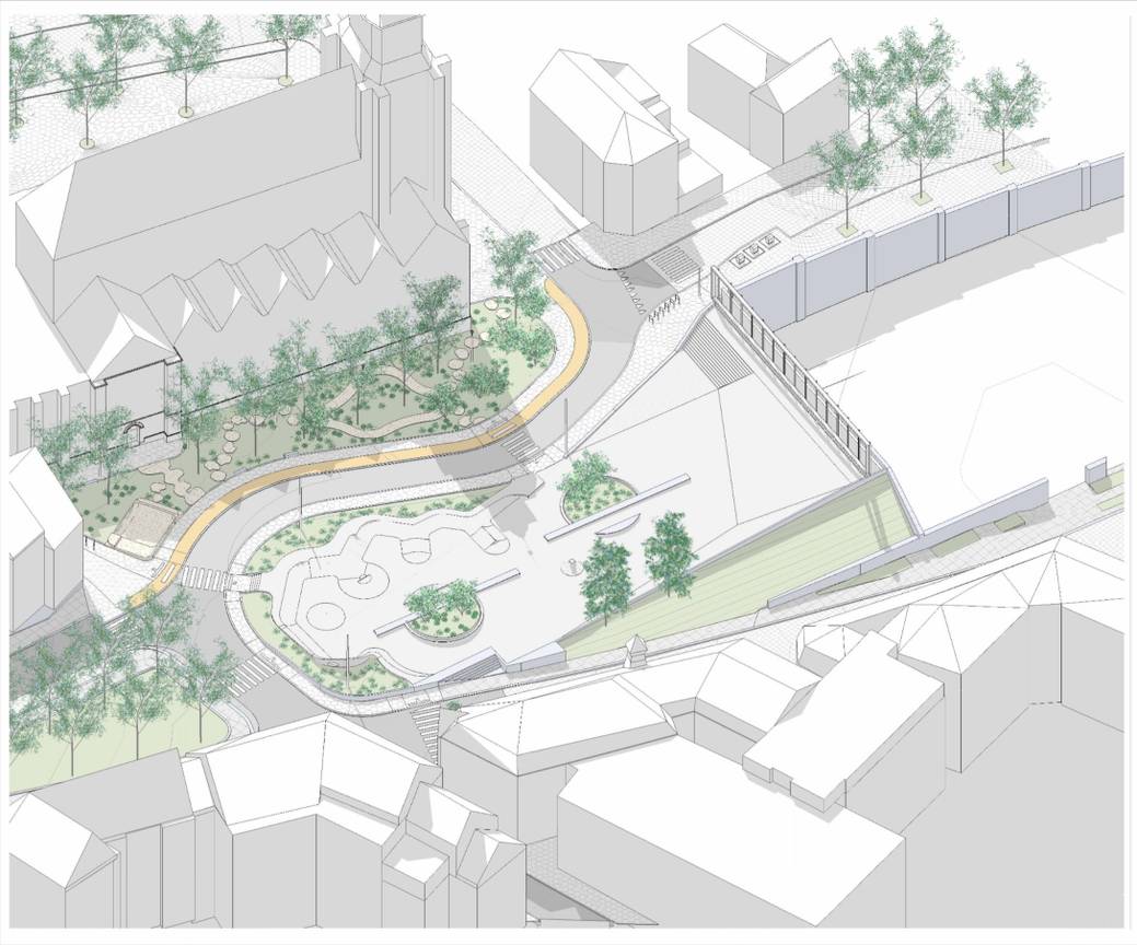 Langs de Onze-Lieve-Vrouwekerk wordt de graszone een parkje met zitplekken. Er komen wandelpaden en rustige oefenzones voor jonge skaters. De mini-ramp krijgt een vaste plaats. Deze zone is vooral bedoeld voor beginners en kinderen.