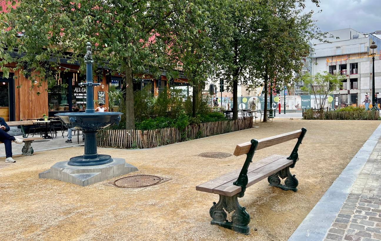 Zo kwamen er onder meer nieuwe natuurstenen kasseien, een zachte ondergrond in het midden die water doorlaat, klassieke banken, nieuwe verlichting, extra beplantingen en meer fietsrekken. Het kroonstuk is het Bruegelfonteintje, dat ooit op het De Brouckèreplein stond en daarna jarenlang verkommerde in het depot van de gemeente.