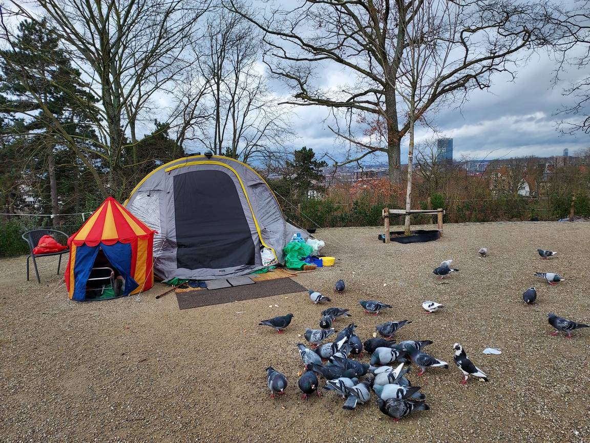 "Ik heb niet veel geld, maar wel net genoeg om eten te kopen en enkele spullen. Ik krijg ook af en toe eten of hulp van voorbijgangers", zegt Lahbib. Hij is de duiven aan het voederen met oud brood en rond zijn tent zie je waterflessen, twee tapijtjes, een stoel en extra kampeerstoel liggen. Met een borstel om afval op te vegen en een grote vuilniszak van Leefmilieu Brussel houdt hij de boel proper. "Ik ben hier bijna drie maanden en heb al twee keer in de sneeuw geslapen. Natuurlijk is dat koud, maar ik wil niet terug naar Samusocial", besluit Lahbib.