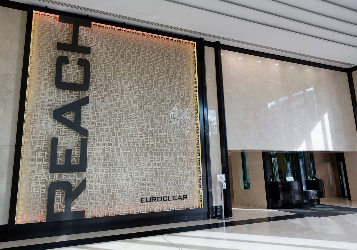| De ingang van het gebouw van Euroclear in Sint-Joost-ten-Node.