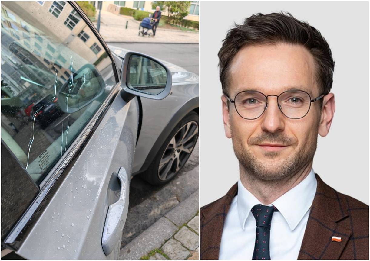 | EU-parlementslid Waldemar Buda (r.) deelde zelf een foto van zijn beschadigde wagen (l.) op sociale media.