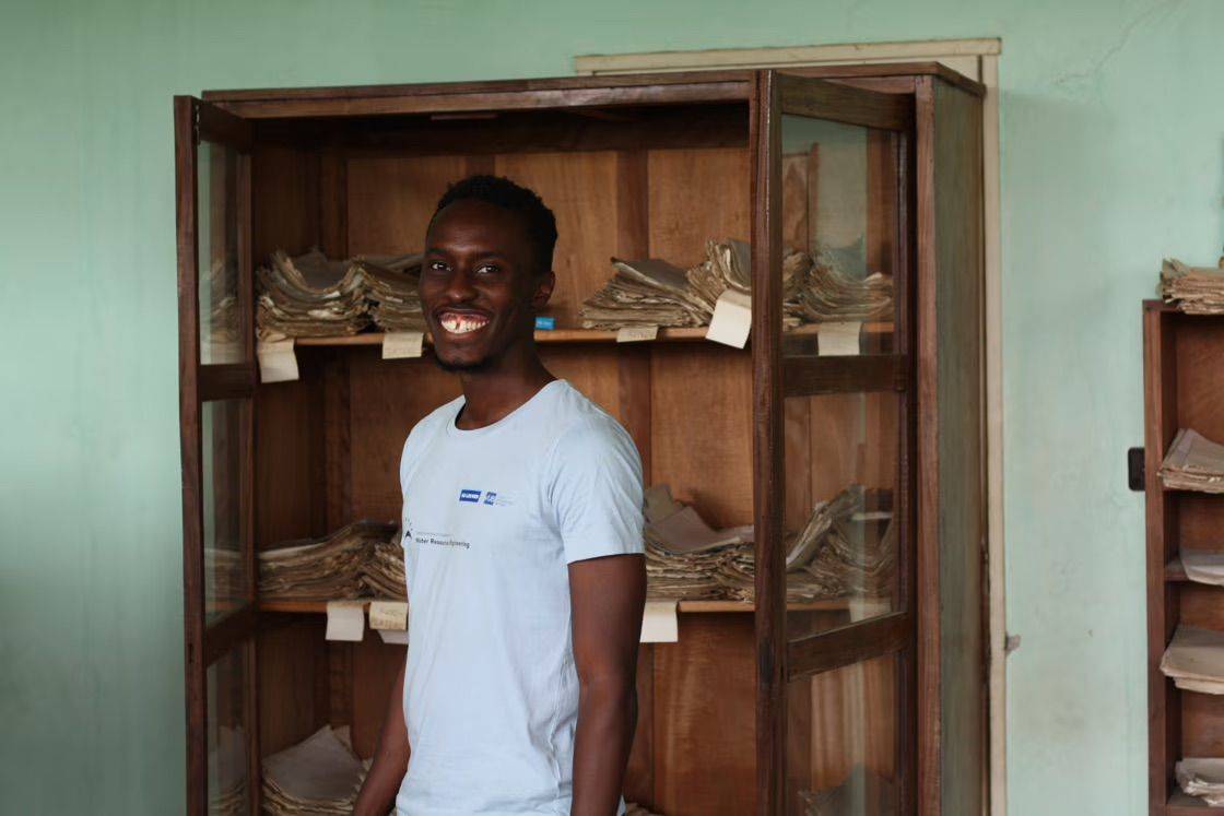 | Derrick Muheki bij een deel van de archieven die hij digitaliseerde tijdens zijn verblijf aan de Yangambi-afdeling van het Nationaal Instituut voor Agronomisch Onderzoek.