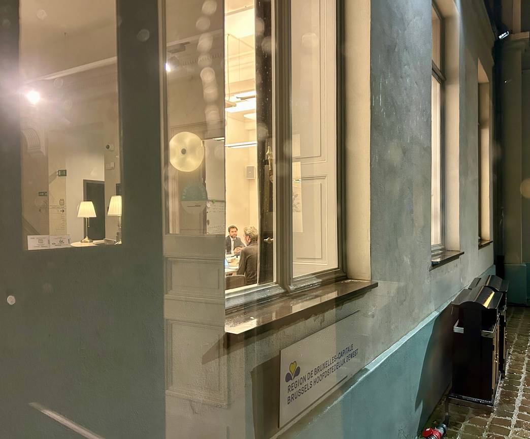 De onderhandelaars van MR, PS, Les Engagés, Groen, Open VLD en Vooruit druppelen donderdagavond mondjesmaat binnen in het BIP (Brussels Info Place) aan het Koningsplein. Intussen staat formateur David Leisterh (MR) de weinige journalisten die nog oog hebben voor de Brusselse begrotingsgesprekken te woord.