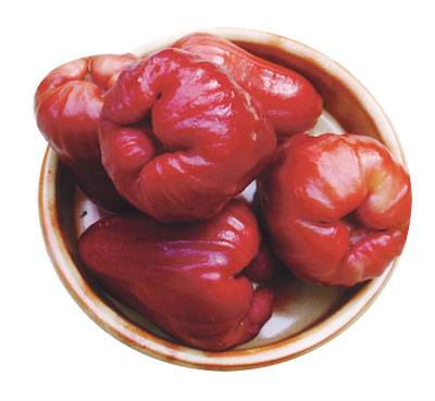 Ik liep in de Chinese supermarkt tussen de verse groente en fruit en kon een verbaasd "Ooo!" niet onderdrukken. Op een schap lagen enkele schaaltjes met rode vruchten die ik ken van vroeger, van toen ik nog in de tropen woonde. Er stond Tubtimjan Rose Apple (red) op. Ik vermoed dat tubtimjan de Thaise naam voor de vrucht is, want daar leek de verpakking vandaan te komen; rose apple is een rare benaming, want de vrucht is noch appel noch roos noch roze van kleur. In Paramaribo noemden we deze lekkernij in het Surinaams Nederlands pommerak.