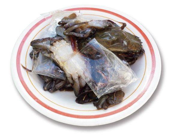 Ik vond een pakje vervelde krabben in de diepvries van de Chinese supermarkt. Het kwam uit Vietnam. Er zaten negen slappe krabjes in voor een halve kilo. Volgens het etiket zijn ze gekweekt en is de soort Scylla serrata, een veelvoorkomende zeekrab uit de Indische en de Stille Oceaan. Individueel zat elke krab in een cellofaantje gewikkeld. Er kwam nogal wat smeltwater uit het pak en ik heb ze laten uitdruppen en dan drooggedept.