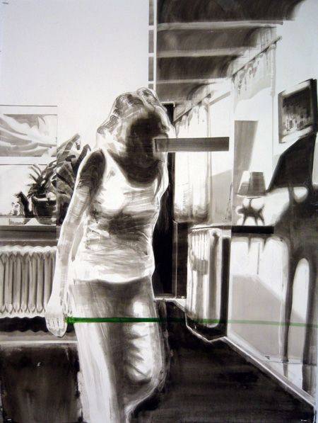 Karel Wouters werkt met verfstift op doek, wat zijn schilderijen een 'droog' effect verleent. Daardoor wordt de materialiteit van het doek extra in de verf gezet. Het is tegelijk een schilderkunstige truc om de inhoud van zijn werken - afbeeldingen van jonge meisjes die niet helemaal gespeend zijn van kitsch - van een weerbarstige angel te voorzien. De Duitser Peter Zimmermann maakt gebruik van polyesterverf die hij als een chemicus in verschillende lagen boven elkaar giet. De combinatie van pure kleuren en mengkleuren zorgt voor een spel van tonaliteit dat zijn schilderijen een frisse en gladde toets verleent. Stefan Serneels maakt dan weer zwart-wit werk in Indische inkt dat zowel het werk van Spilliaert als de film noir oproept. Hij maakt bevreemdende tafereeltjes die doorgaans plaatsvinden in gesloten interieurs, als een soort huiskamerdrama's. Doordat de kunstenaar een loopje neemt met het perspectief wordt het gevoel van beklemming en vertigo ook ruimtelijk benadrukt. De werken zijn uitgevoerd in zwart-wit maar vertonen de laatste tijd steeds vaker een strookje kleur om een accent aan te brengen. Van de jonge Roemeen Maxim Liulca is slechts één werk te zien, maar het volstaat om te overtuigen. De kunstenaar vertrekt van een figuratieve afbeelding die over de lengte van het doek steeds meer abstracte elementen vertoont. In tegenstelling tot sommige van zijn landgenoten - van de gehypete school van Cluj - wil hij met zijn schilderijen niet refereren aan het beladen verleden en de figuur van Ceauşescu, maar verkiest hij abstractie. Ook de schilderijen van Tina Gillen en Manuel Caeiro combineren op geslaagde wijze figuratieve en abstracte elementen. En zo geeft Dry and wet in haar beknoptheid een boeiend beeld van diverse schilderspraktijken.