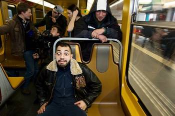 D ie ochtend is de redactie van De Morgen aan de Arduinkaai even de redactie van een televisiezender. De schrijvende boegbeelden Bart Eeckhout en Yves Desmet lopen ook wel ergens rond, maar in de scènes die nu gedraaid worden, draait het om andere journalisten: Eva (gespeeld door Laura Verlinden), haar camera- en geluidsman (Geert Van Rampelberg en Wouter Hendrickx), haar lichtjes onuitstaanbare collega Mich (Jeroen Vander Ven), en hoofdredacteur-presentator Herman (Gène Bervoets).