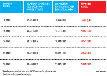 Romain betwist dat. “Het is alleen geld dat je minder moet lenen. De eindsom is negatief.” Een gezin met twee dat op vijfentwintig jaar leent verliest op deze manier bijna 60.000 euro. En de single? Ook die verliest, al is het financieel nadeel minder uitgesproken. Alleen als hij op tien jaar leent, schiet hij er financieel niet bij in.