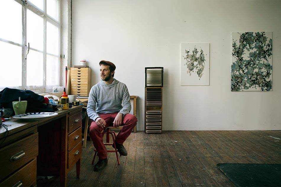 L'œil fait le tour de la pièce et se raccroche à quelques détails : un vieux canapé assoupi au milieu de la pièce, la pochette de la bande-son de The Godfather, des étagères dans lesquelles ses œuvres sont soigneusement rangées. Au cœur du travail non-figuratif de Luis Pôlet, on trouve l'encre, un fondamental qu'il utilise depuis douze ans. " C'est une encre sépia dont les pigments peuvent être décomposés. J'ai découvert son potentiel en la renversant sur du papier. Le lendemain, l'encre supposément noire avait fait place à d'autres couleurs ", commente l'intéressé. Luis Pôlet choisit de l'appliquer directement sur la toile ou de la répandre par le biais d'une matrice. " Je cherche une tension entre maîtrise et aléatoire, même si au fil du temps, il y a de moins en moins de place pour l'accident ", avance-t-il. Afin d'exprimer tout le potentiel de l'encre, l'artiste attache beaucoup d'importance aux apprêts.