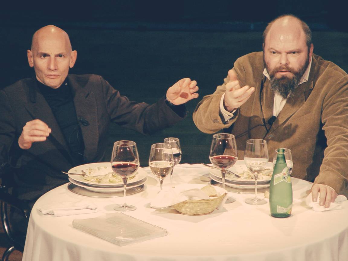 En 98, Damiaan De Schrijver de la troupe tg STAN et Peter Van den Eede de De Koe créent en néerlandais une pièce adaptée du film de Louis Malle My Dinner with André. Tout au long d’un repas, deux amis discutent de l’art du théâtre, de la création, du mensonge et du sens de la vie. Cette conversation hilarante est ensuite adaptée en français pour le grand plaisir de Paris. Ils aiment traîner à table et ont beaucoup de choses à dire. Les 3h20 du spectacle passent pourtant sans temps mort tant les deux acteurs sont drôles, justes et vivants. Une démonstration de théâtre sans un gramme de cabotinage.